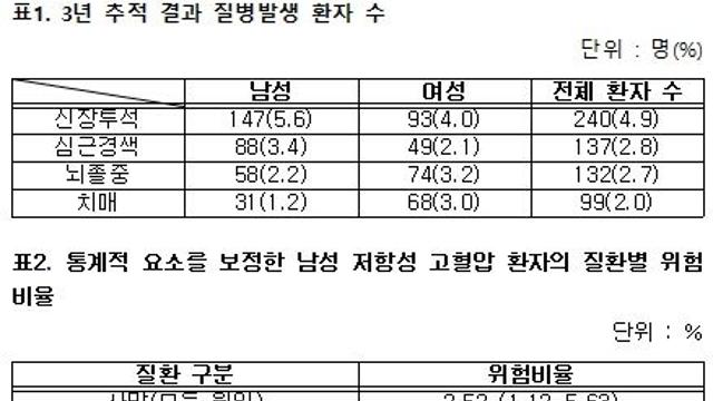 저항성 고혈압 환자…남성, 여성보다 발병 8.2년 빠르고, 심혈관 질환 발병 위험도 높아